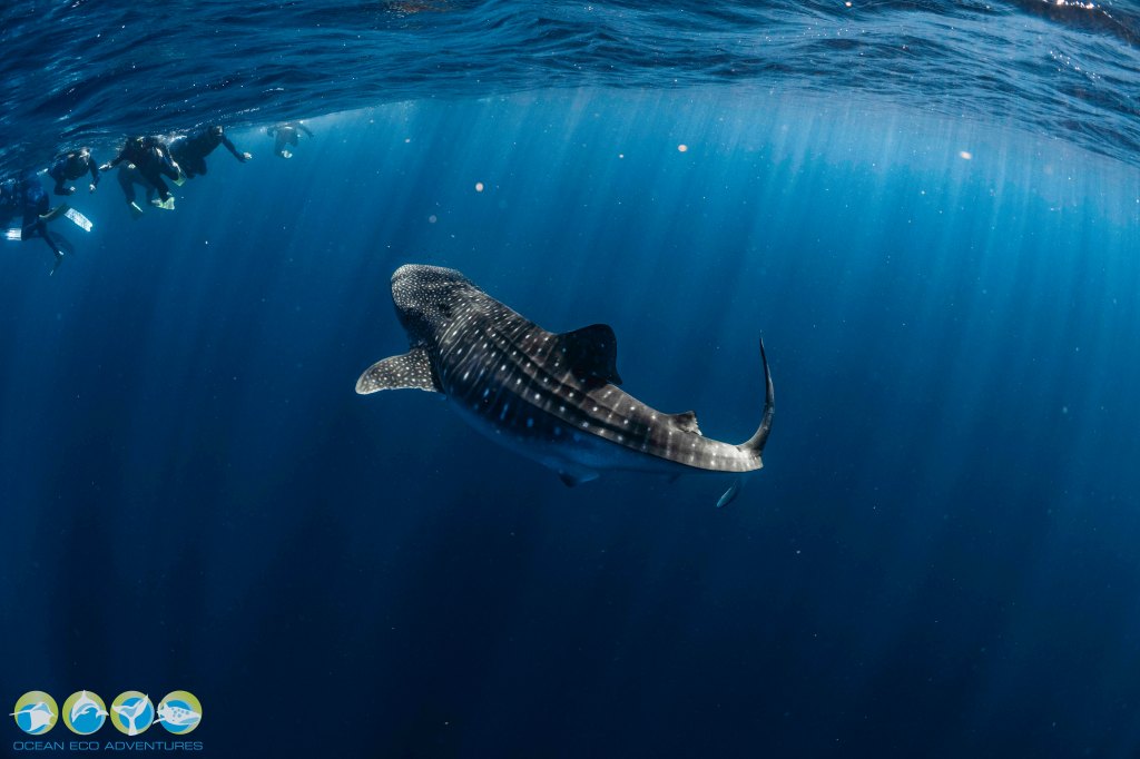 When the boat was in position we heard go go go and we all slid into the water. Once in, we lined up from our guide so that we were in a good position so the whale shark would swim right past us. Before we knew it, the whale shark came into view and as it came alongside, we started swimming along with it. The whale sharks are such amazing, beautiful, and graceful creatures and what an amazing feeling to be able to swim along right next to one.