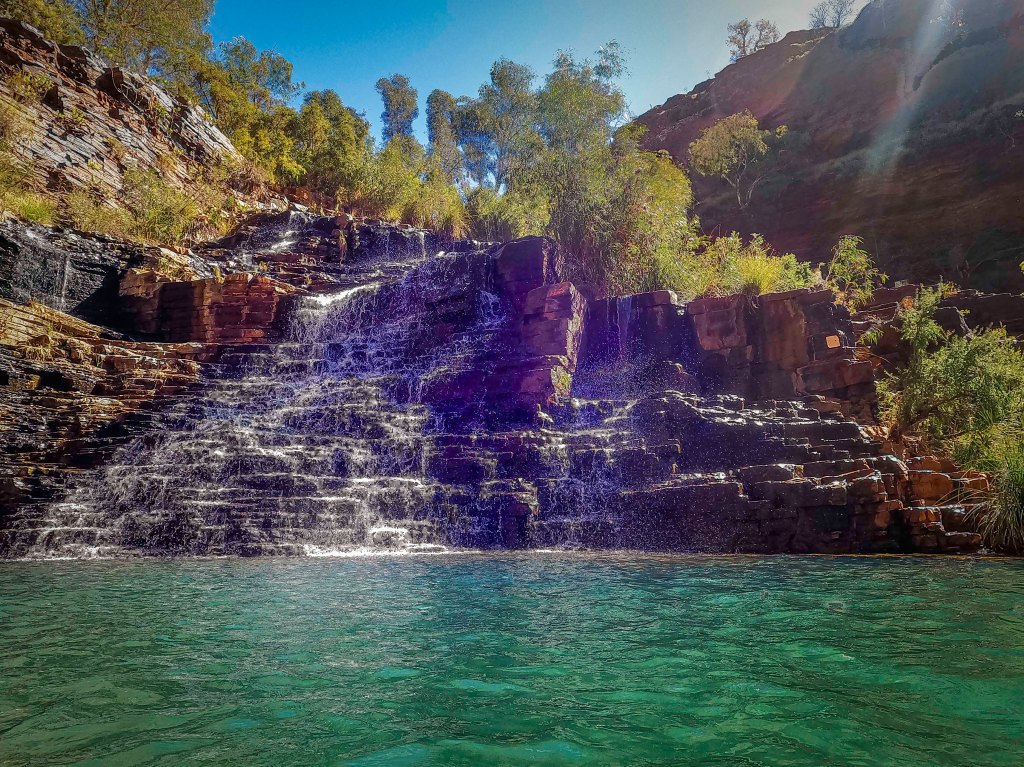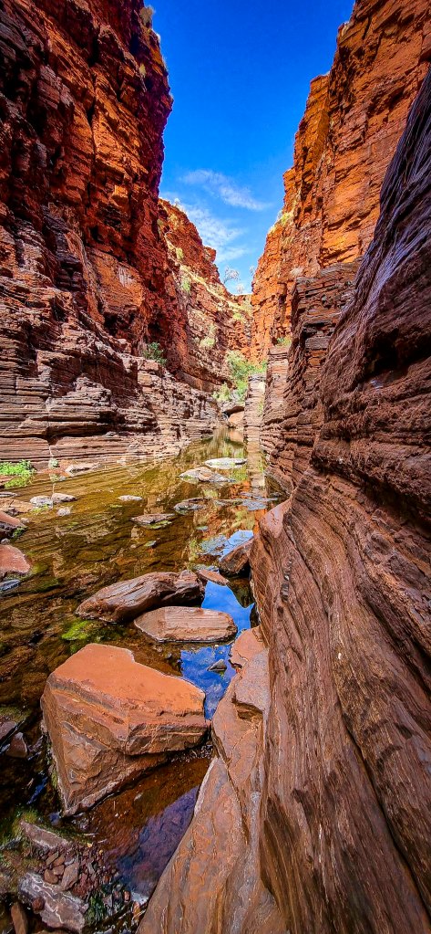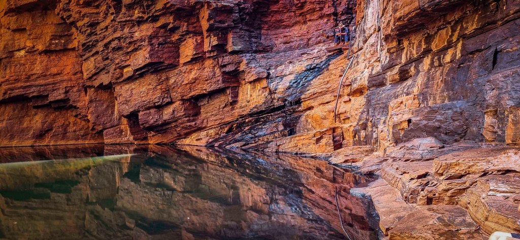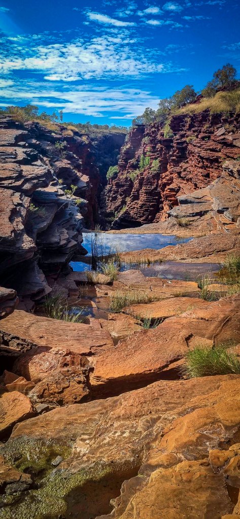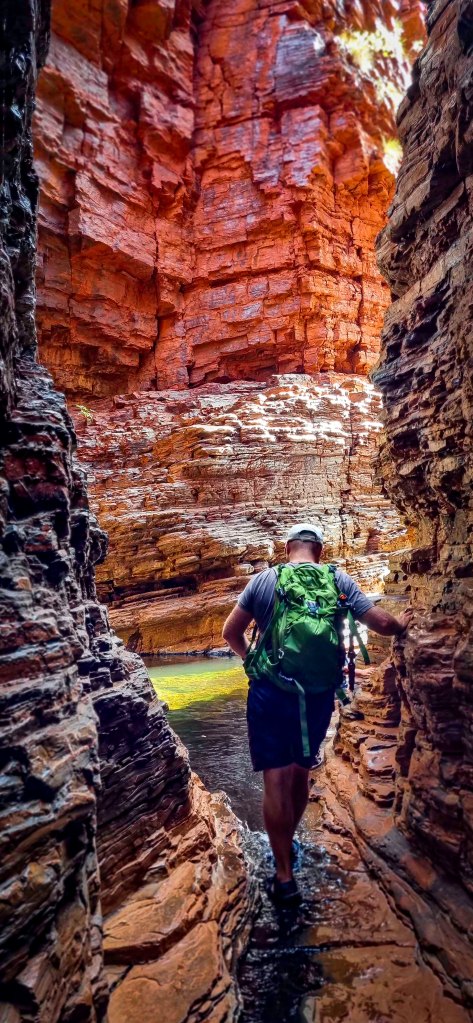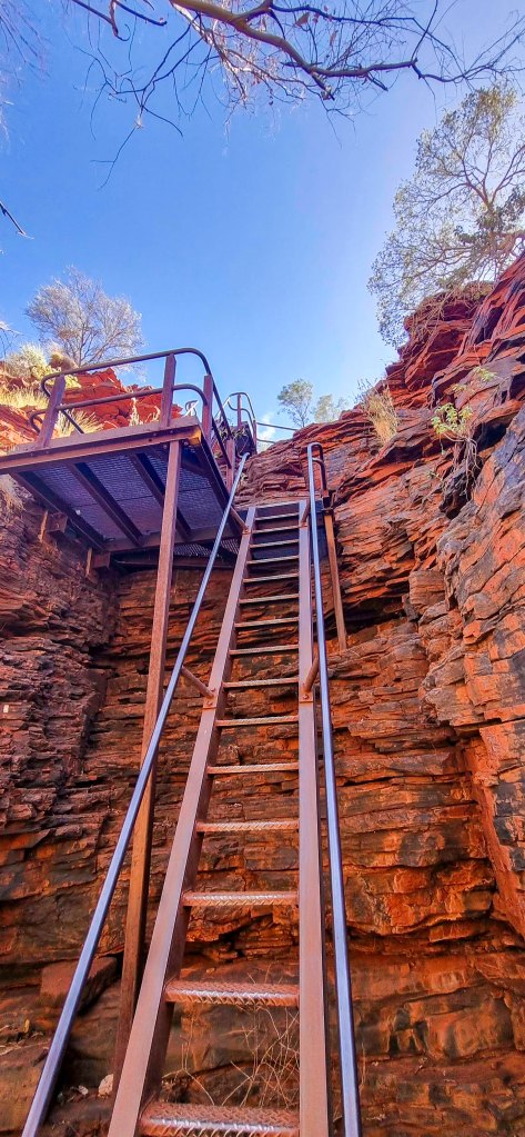 After lunch we decided to tackle the lower Weano gorge down to handrail pool. Although another class 5 track for the most part we found it not quite as tricky as Kermit’s pool. The 1st part is relatively straightforward down the stairs and following the bottom of the gorge over the rocks and either through a water hole or climbing along the rocks beside it which we did and was definitely easier than the one in Hancock gorge.