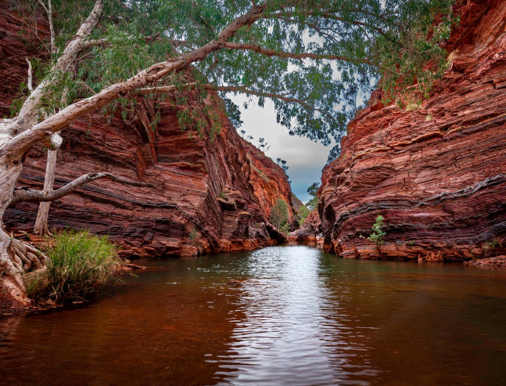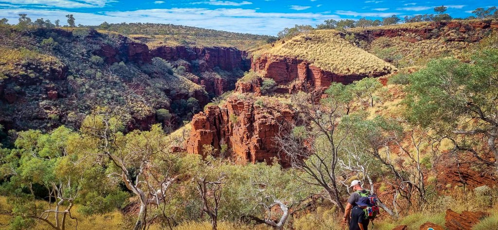 Tuesday we had a bit of a slow start but we eventually got going and did the 3.4km circuit walk of Dales gorge. From the lookout to Fortescue falls we headed along the top of the gorge for a bit over a kilometre before dropping down into the bottom of the gorge and starting winding our way back along the river. As we walked along, we found some lovely cascades and a nice deep water hole tucked in amongst the gum trees. For parts of the path we had to skirt the bottom of the cliffs and hop from one stepping stone to another which the boys thought was great fun.