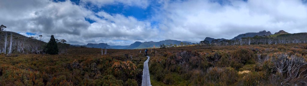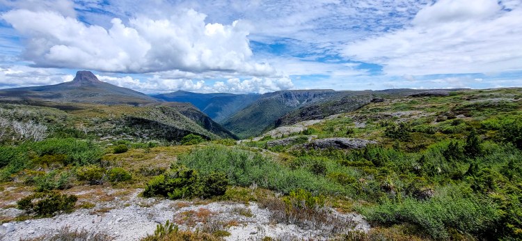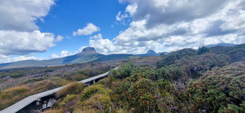 Once up at Marion’s, we all took a short break and enjoyed the view of Cradle mountain, Dove lake and the surrounding area. Once on the move again it was a more leisurely walk up and down through 3 small valleys on the plateau on well formed track and duckboards to reach kitchen hut for some lunch.