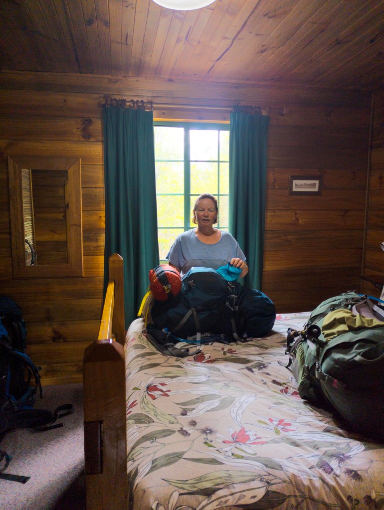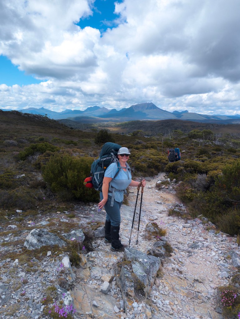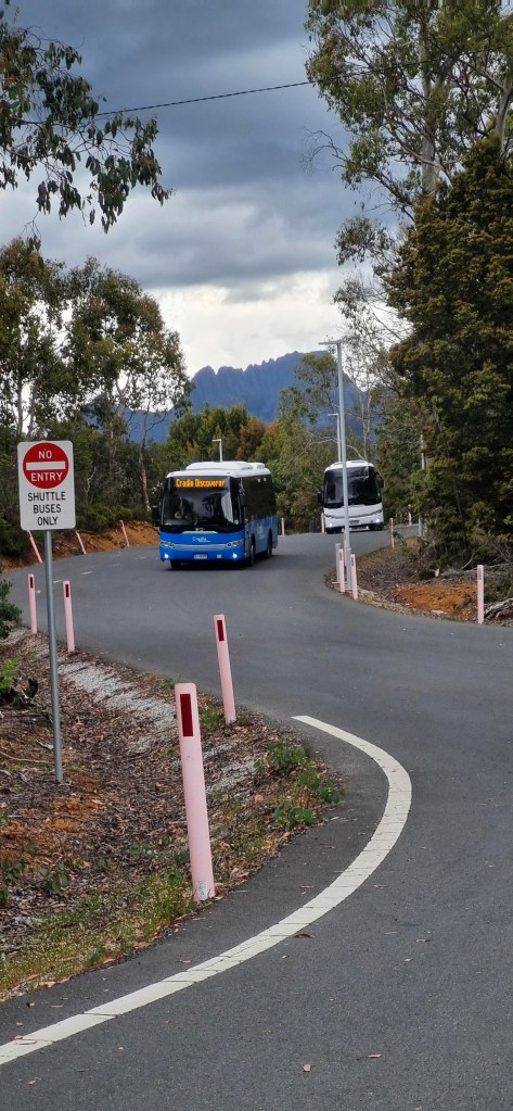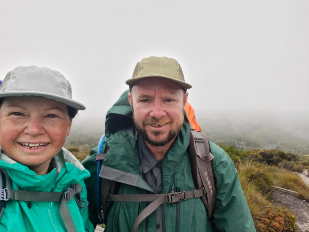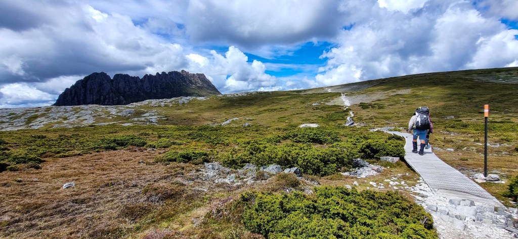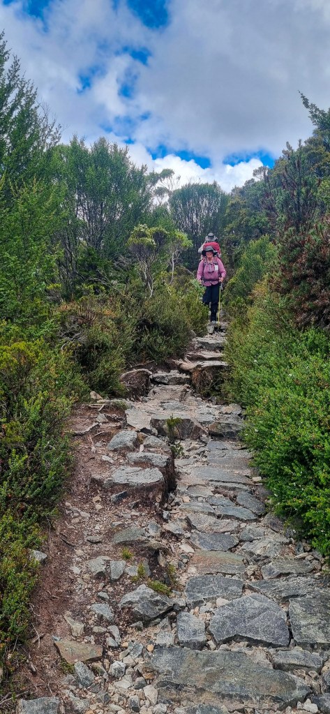 After breakfast, we packed up to made sure we were ready and the bus came to pick us up at 10am, for a 2 hour drive to Cradle Mountain. We went with Overland Track transport to get to Cradle Mountain, and then back from Lake St Clair at the end of the trip. They stored our other luggage for us, while on we were on the track, and also organised gas canisters for us for cooking. Since you can’t bring the gas with you on the plane, it was extremely helpful. They also hire out various items. Judd and Angie hired a PLB (personal locator beacon) for extra safety, in case of an emergency. We have a Garmin with the Inreach features, which we always carry on hikes. We were able to send an email each afternoon, once we reached the hut, to our boys so they could see roughly where we were each day, and know that we were safe.
