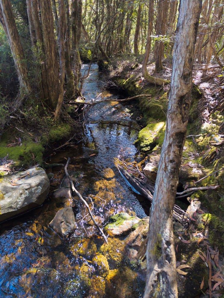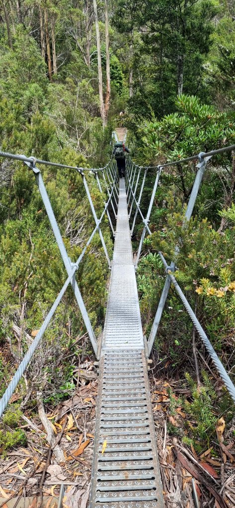 We all had a quick bit of lunch at the intersection, but didn’t want to hang around for too long as there were lots of flies. From the Overland track to Pine Valley hut was about another 5km, a gentle uphill walk but not to strenuous. There is even a couple of suspension bridges to cross on the way. Once into Pine valley it was very pretty winding between the moss covered trees, lots of large tree roots, and walking beside the river to reach the hut.