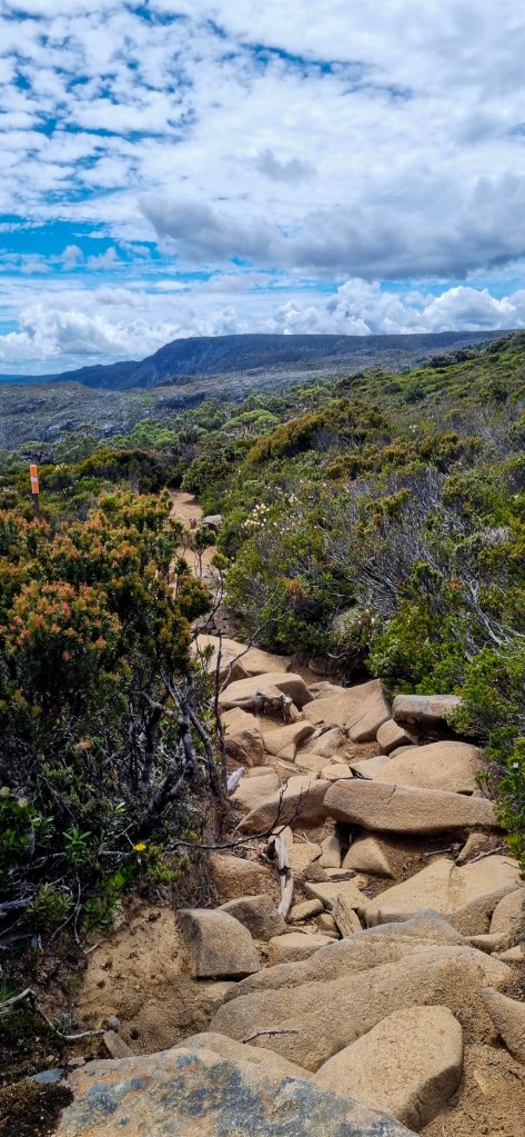 Saturday January 18th, we had a bit of a slower start to the day and thankfully Belinda was feeling much better. After packing up and breakfast, we were off down the track again. Today we continued down the overland track for about 5.5km, a relatively straight forward section of track with a few ups and downs through more traditional native Australian bushland, past the end of the Acropolis to the intersection of the Pine Valley track. The track was a bit rough with rocks so we still had to be cautious.