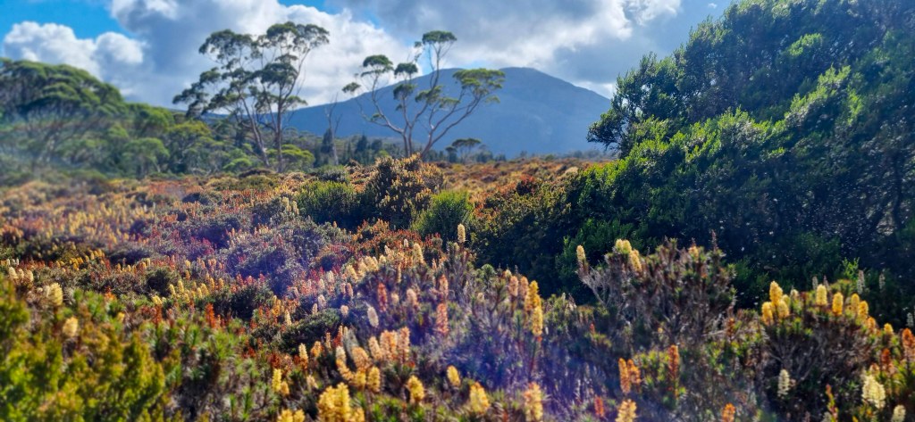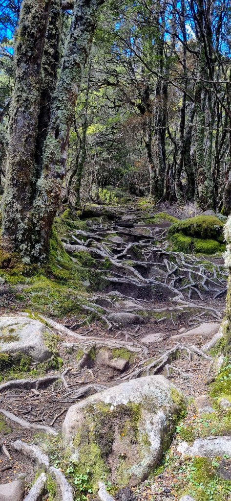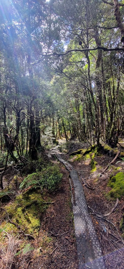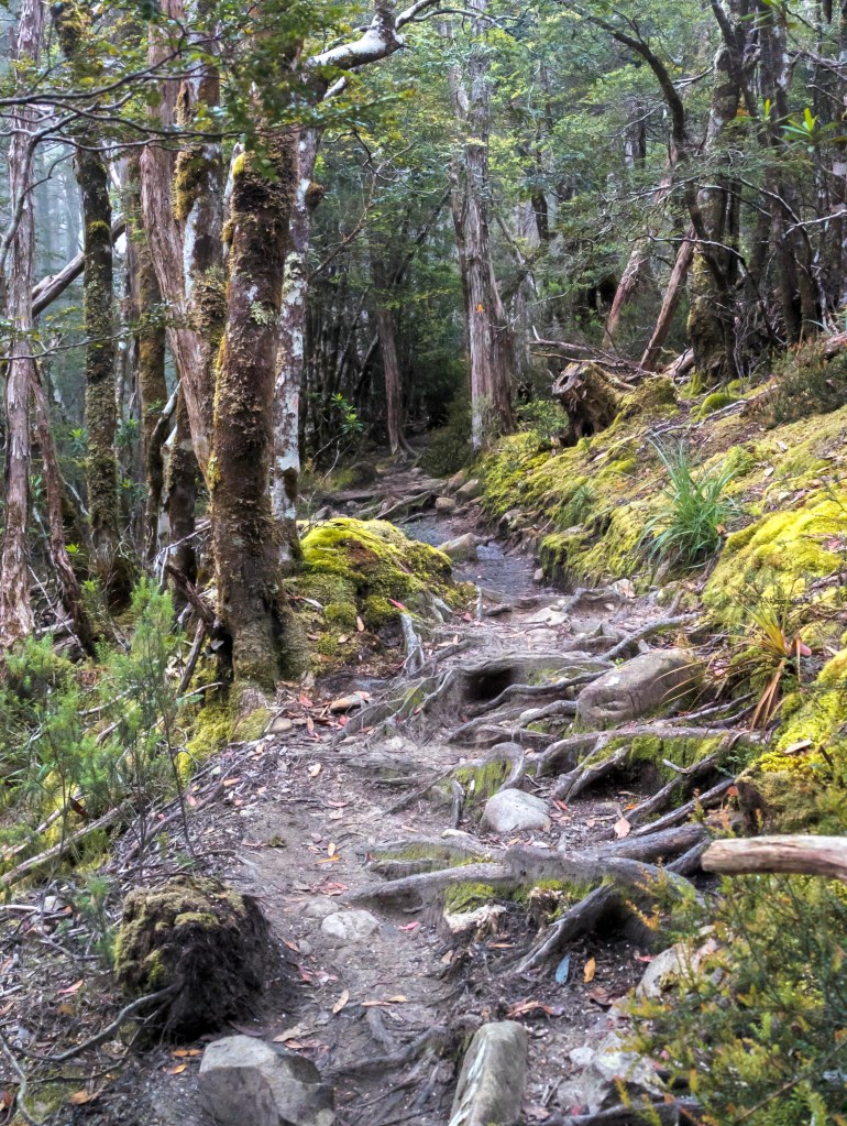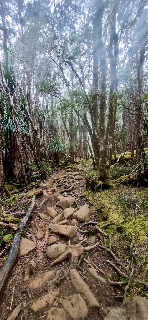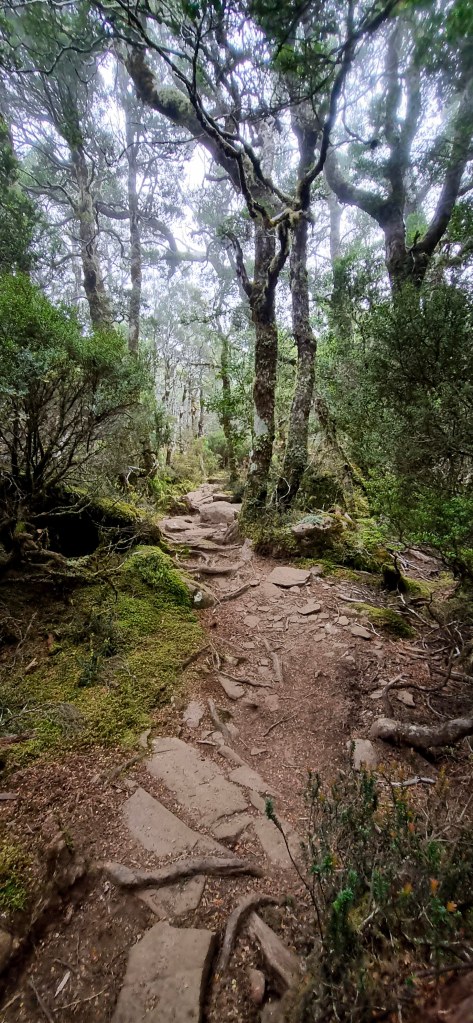 Thursday, brings us the possibility to do a side trip of Mt Ossa, Tasmania’s highest mountain. It was a bit cold to start the day and I was wearing a thermal top under my shirt, and the rain jacket to stop the wind chill. The days walking started relatively flat but then went into a steady climb over about 3km up to Pelion gap, which was the high point for the day, and also the intersection to do either Mt Ossa or Mt Pelion east. Walking through the forest almost to the top of Pelion gap was very pretty with lots of moss covered trees and rocks, and not to may muddy parts.