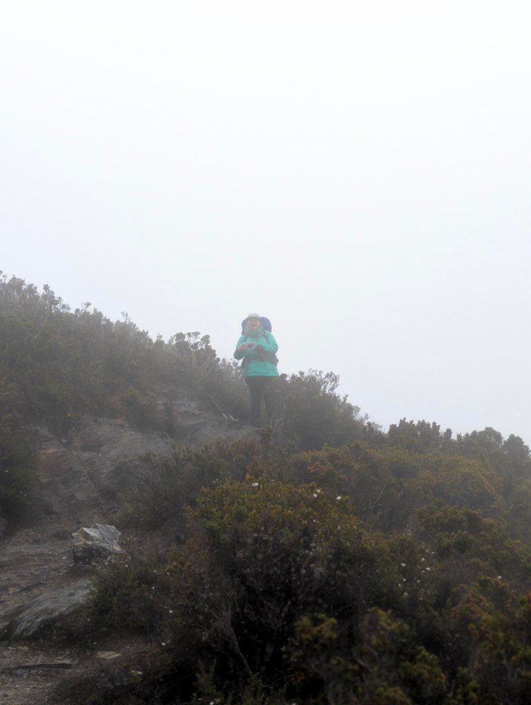 We continued over the hill and back out onto more open areas for a while before starting a steady descent down to frog flats, where we stopped at a river for lunch. It was a very quick lunch of wraps, we got going again as we were getting cold sitting around in the misty weather. The track today was quite wet in parts, and in some places we could step around it. But it is definitely better to just walk through it, as going around had awkward foot placement and risks rolling ankles or hurting knees. Or as Belinda did, slipped and fell into a tree. Plus, if everyone tries to walk around the muddy water puddles, it unfortunately widens the track, as it damages the growing flora and fauna surrounding the track.