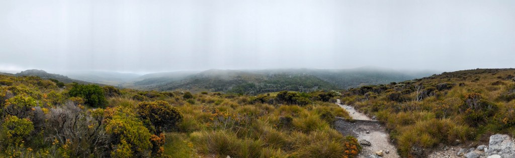 The start of the day involved an uphill section through the trees and onto the higher alpine meadow area, where the wind really had a chill to it and at times, we were walking in the cloud. When we did get a good view of the surrounding area, we could see down the valleys either side which was cool.